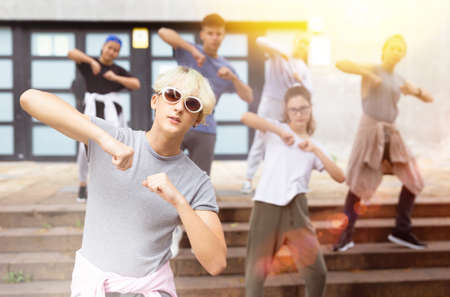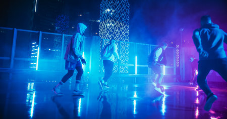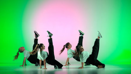 An urban dance group showcases youthful energy, diversity, and team spirit in vibrant performing arts. Concept of modern choreography and cultural fusion.