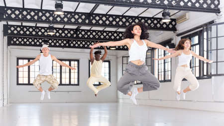 People in casual clothes training hip-hop in class, posing and having fun