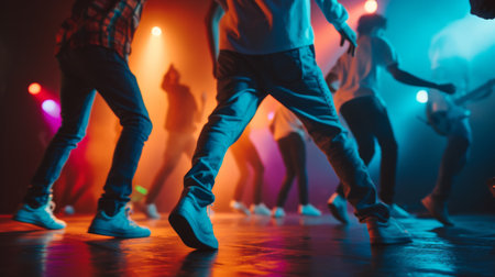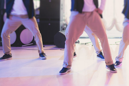 Group of hip-hop dancers performance on a stage, modern contemporary street dance with break dancing in studio, hip hop dance training in a ballroom, sneakers close up