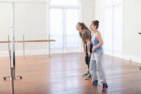 Two teenage girls doing warm up dance in ballet school