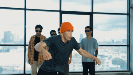 Multicultural hipster group walking while dancing at modern corridor. Attractive break dance team happy and joy while moving to hip-hop music. Active. Site view. Outdoor sport 2024. Endeavor.