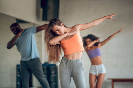 Three active millennials keeping arms in front of themselves during vogue dance while training or performing in modern studio