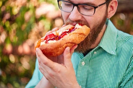 Hungry young man eating a hot dogs in cafe. Background. Restaurant