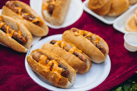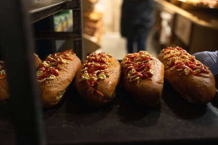 Fresh hot dogs on display with sausage and lots of cheese. Fast food concept.