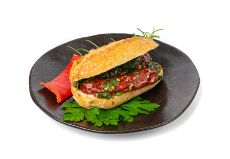 Choripan Sausage Sandwich Isolated, Traditional Chimichurri Bread with Chorizo and Chimichurri, South American Street Food, Choripan Sausage Sandwich on White Background