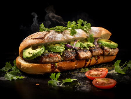 sandwich with grilled meat and vegetables on a black background, close-up