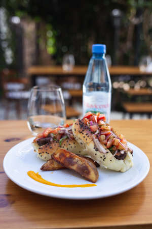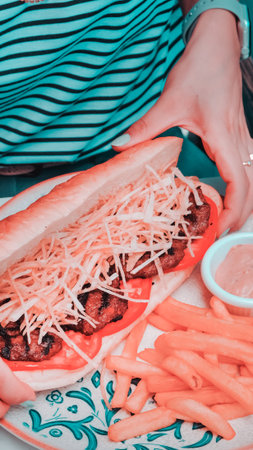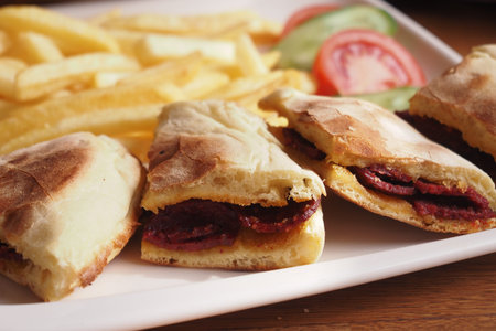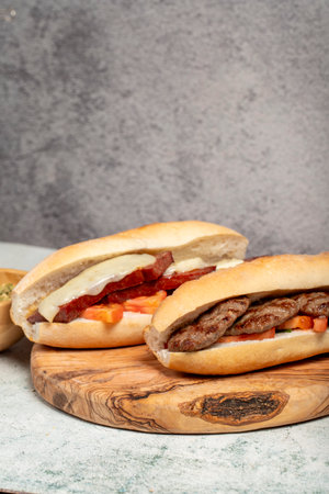 Turkish bread with kashar sausage and meatballs on the presentation board. Local name sausage and meatballs in bread
