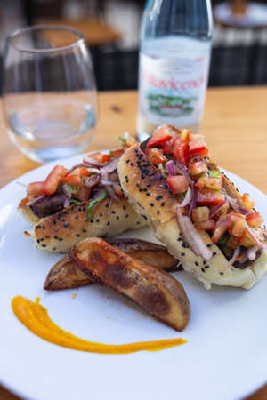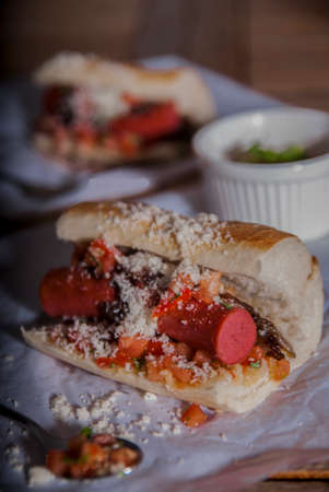 Chilean and Argentinian food. Traditional choripan with spicy pebre, chorizo sandwich with chorizo sausages and bread.