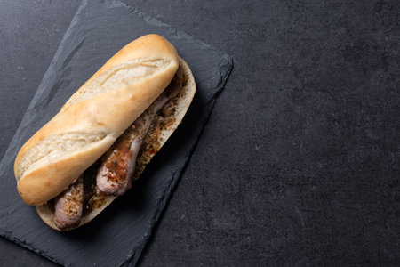 Traditional choripan, Argentina sandwich with chorizo and chimichurri sauce on black slate background