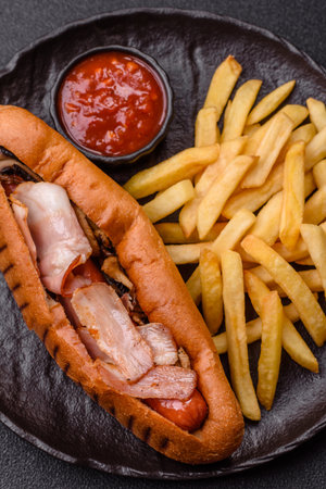 Sandwich with meat and vegetables and potato chips on a stone background. Selective focus.