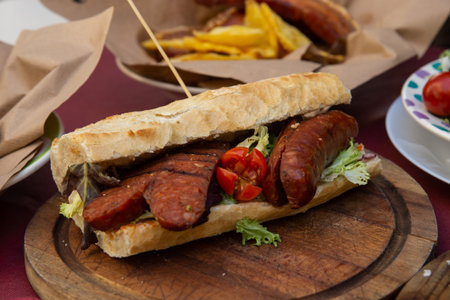 Creole sausage sandwich on wooden plate with wine