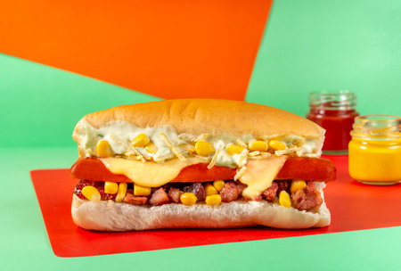 Hot dog with corn, ketchup and mayonnaise on a yellow and red background
