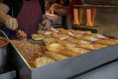 Street food in Amsterdam on sunday market. The cook is doing toasts with fried sausages and mustard.