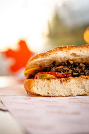 Close-up image of tasty grilled hot dog laying on picnic table