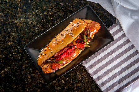 Sausage onions and peppers hoagie sandwich with tuxedo sesame seeds