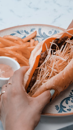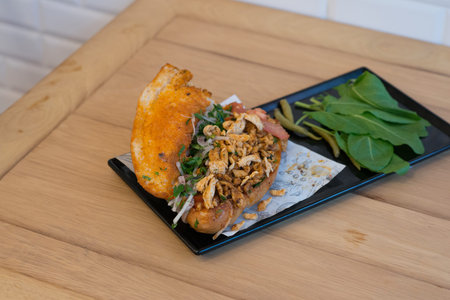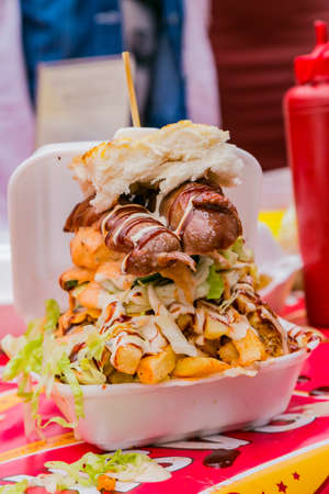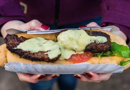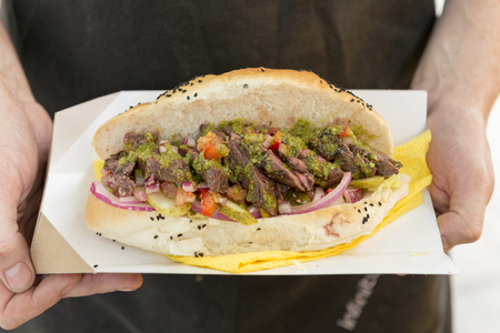 Sandwich with lamb meat, rocket salad, tomato, and aioli at street food market.