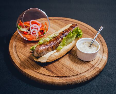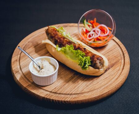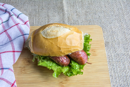 Hot dog with lettuce and sausage on a wooden cutting board closeup