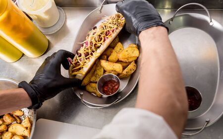 The chef cooking hot dog on a grill. Restaurant.