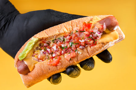 a hand in a black glove holds hot dog on a yellow background
