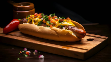 A hot dog adorned with mustard, ketchup, cucumber, and tomato is presented on a wooden kitchen board, offering a classic and appetizing snack.