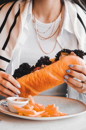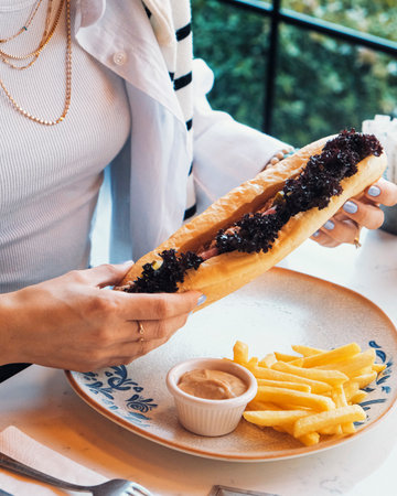 Woman eating a hot dog with black caviar and french fries.
