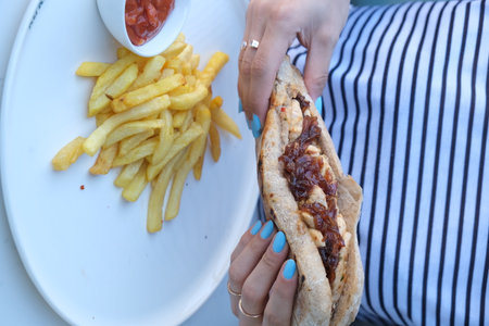 Chicken, pork or lamb wraps or pita sabich sandwich - pita stuffed with fried ingredients and hard boiled eggs Iraqi Jews dish