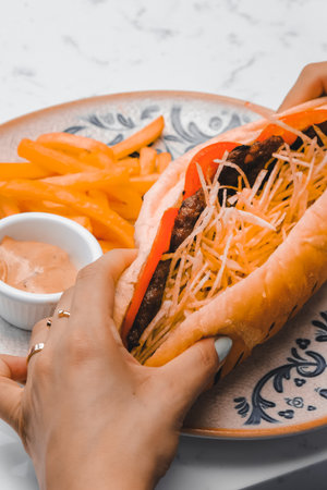 Beautiful young woman with sunny smile eating juicy burger . Close-up of fast food on the nature background.