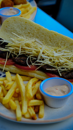 Fast food in the restaurant hamburger and fries in Playa del Carmen Quintana Roo Mexico.