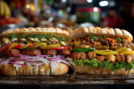 Two delicious sandwiches filled with grilled meats and fresh vegetables are presented at a busy market stall.