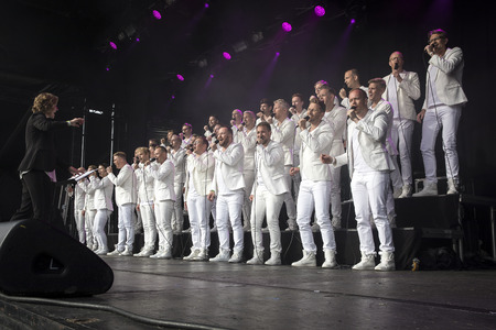 Traena, Norway - July 7 2017: concert of Norwegian gay choir Oslo Fagottkor at Traenafestival, music festival taking place on the small island of Traena