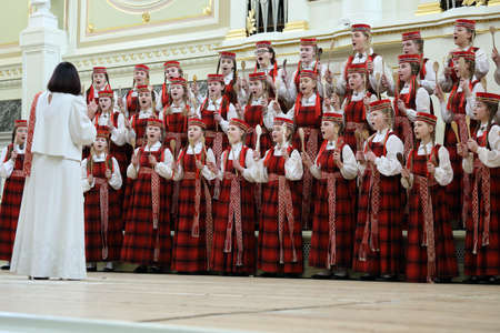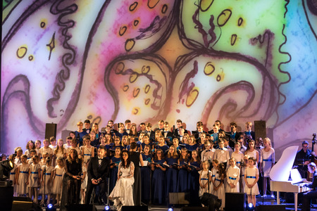 Saint-Petersburg, Russia - February 25, 2018: Children's Choir Lielvarde, Latvia performs during V Children and Youth World Choral Championship. First championship was held in Hong Kong in 2011