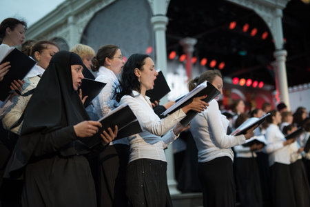 Valaam Island, Russia - July 28, 2015: First St. Vladimir Valaam Festival Illuminator of the Orthodox singing. Public free access for all comers. Orthodox choir is singing