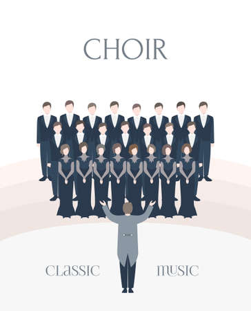 Vertical advertising poster of performance classical choir. Man and woman singers together with conductor. Colorful vector illustration in flat style with lettering.