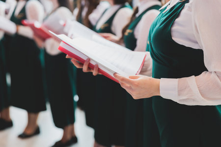 Church choir concert in cathedral, choral artists singing, group of European boys and girls singing in a chorus, students and choristers in white and green uniform performing on stage with conductor