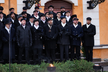 Finland. December 2025. Photo of a male choir performing on a Christmas square during a holiday celebration. The image captures singers in a festive outdoor setting