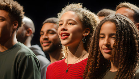 Portrait Of Male And Female Students Singing In Choir With Teacher At Performing Arts School