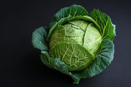 Vibrant green cabbage with lush leaves, isolated on a sleek black backdrop