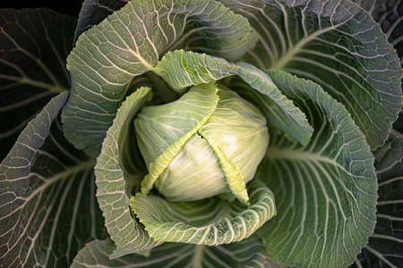 Head of green cabbage in organic home farm vegetable food