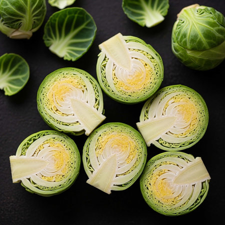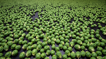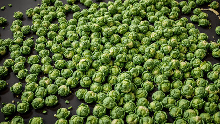 Vibrant cluster of freshly harvested Brussels sprouts glistening with tiny water droplets, highlighting their crisp texture and rich green tones against a sleek dark