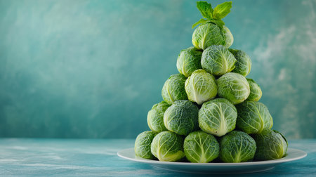 Creative Christmas Tree Made of Fresh Brussel Sprouts on White Plate, Isolated on Blue