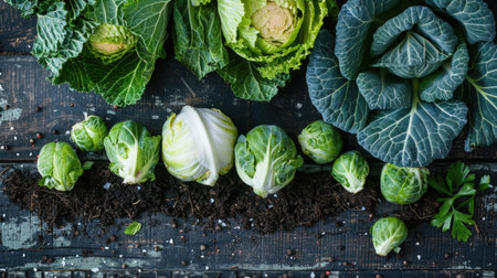 Freshly picked Brussels sprouts and cabbage on a rustic farm table, soil clinging to the roots, showcasing the beauty of farm-to-table freshness.