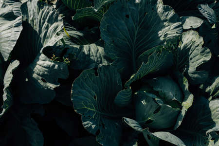 Gardening and agriculture concept. Green leaves of young cabbage, top view. Natural background