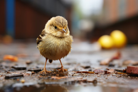 sparrow staring at its reflection in a puddle after the rain, created with generative ai