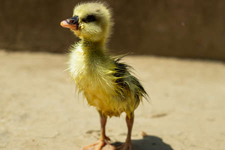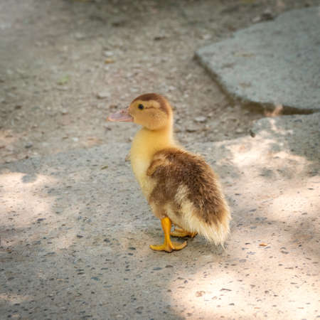 Little duckling on the shore of a lake. Selective focus.