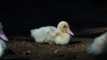 Little Muscovy duck in the morning sun. Black background. Focus selected