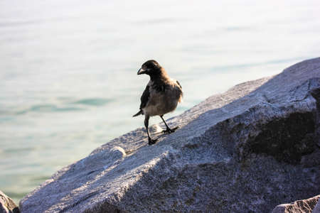 A single adult gray Hooded crow sits on top of a gray granite stone against a blue water in river. A large black-gray plumage clever bird with a big beak on the rocks by a sea. Wildlife. Ornithology.