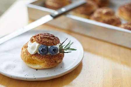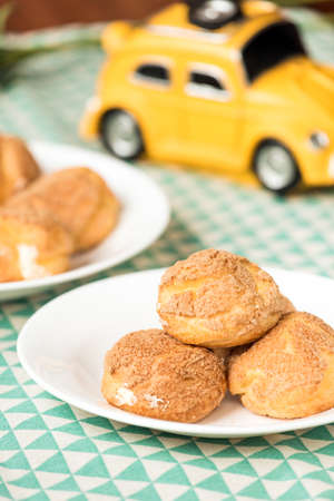choux cream or cream puff or French profiteroles with fresh cream set on cafe table.