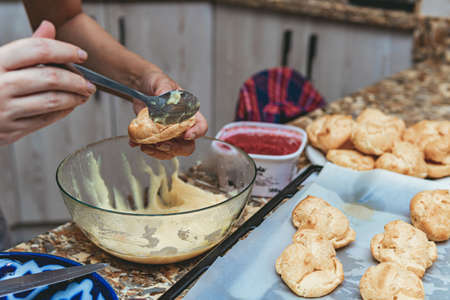 Homemade Craquelin Choux biscuits (crispy cream puffs). Pastry chef holding Craquelin Choux biscuits (crispy cream puffs) preparing to put the filling.