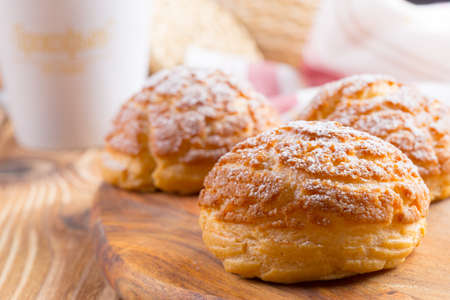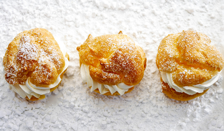 Delicious and fresh cream puffs made of vanilla cream and sugar. Cream puffs as a small sweet snack.