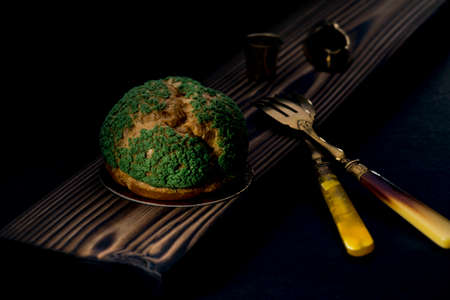 Tasty Mini Green Tea Choux au Craquelin or French Crunchy Cream Puff filled with delicious and creamy Chantilly Cream on a wooden tray. Selective focus.